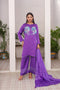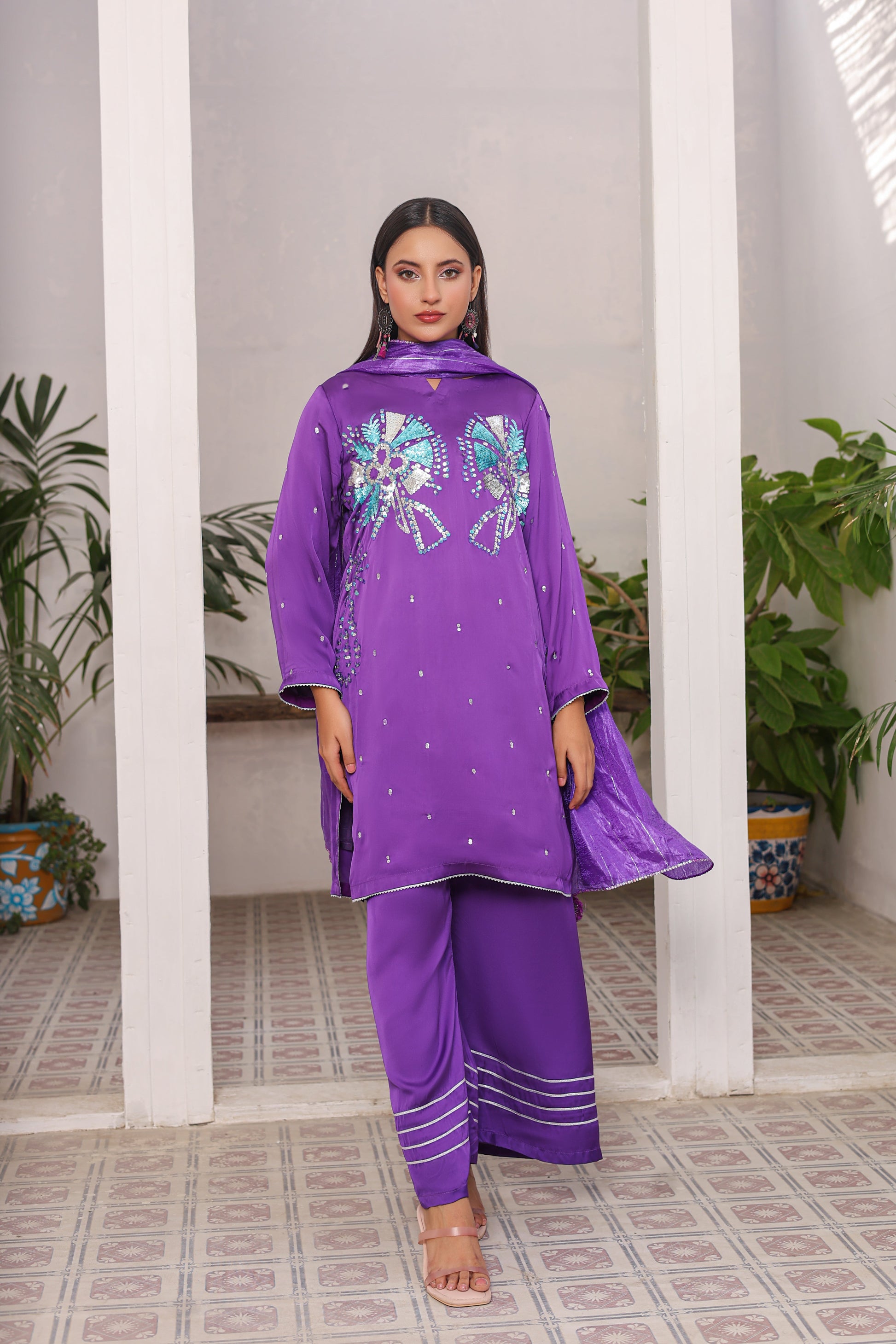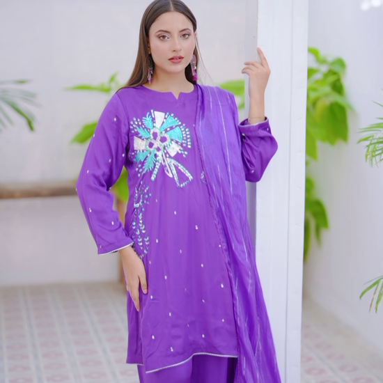 Featuring a delicately hand-embroidered silk shirt, paired with a stylish plazo for a modern touch, and completed with a flowing chiffon silk dupatta. This ensemble blends luxury with comfort, making it a timeless choice for festive and formal occasions.