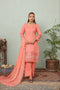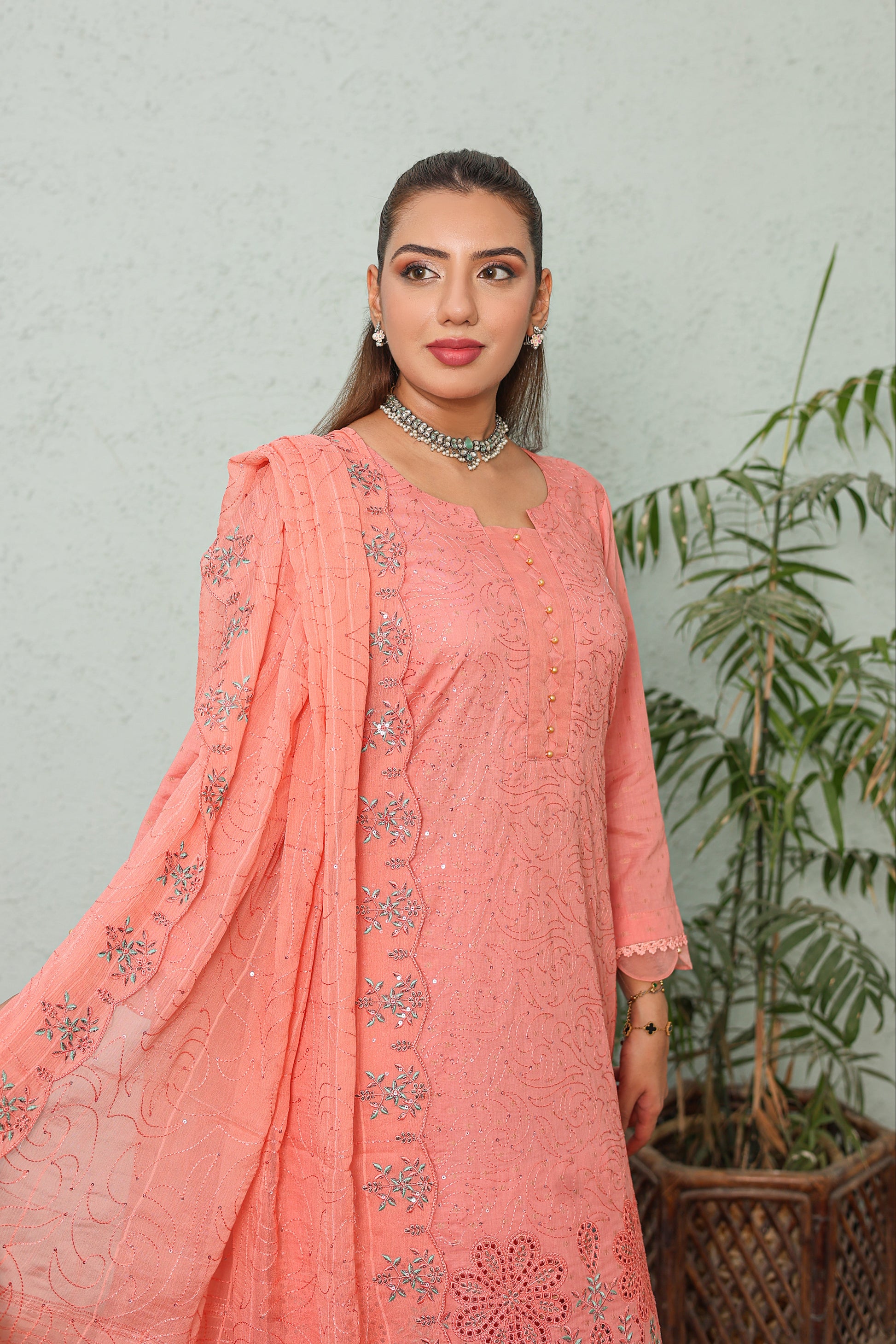 This sophisticated three-piece set includes a chicken kari shirt crafted from self-design lawn fabric, paired with an intricately embroidered dupatta that adds elegance and texture. Designed for comfort and style, this ensemble is perfect for those seeking a refined yet breathable outfit suitable for various occasions.
