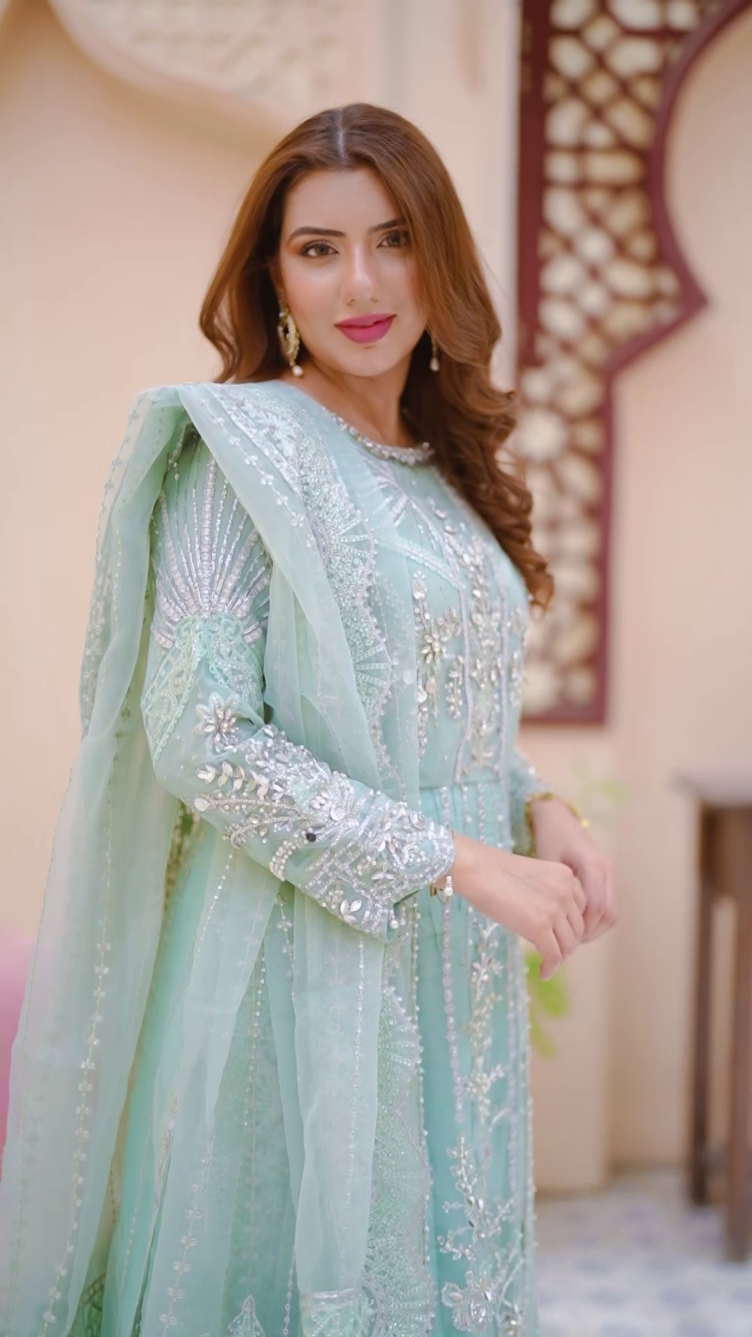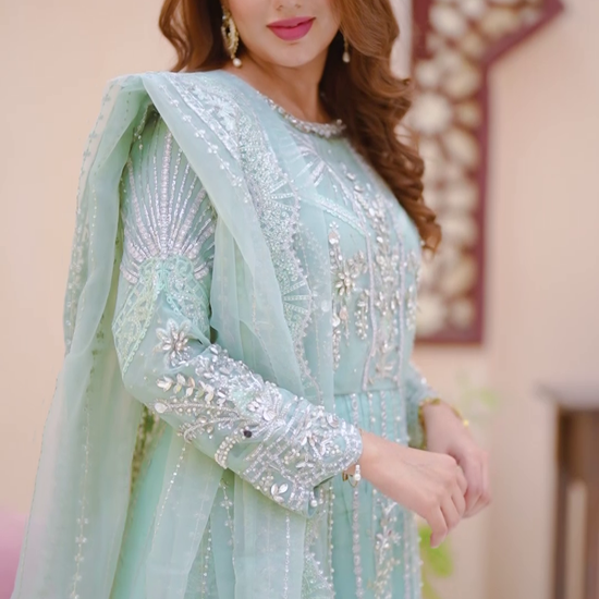 This sophisticated 3-piece set features a touching maxi made from delicate organza fabric, adorned with detailed machine embroidery enhanced by handwork. The raw silk lehenga adds a rich, luxurious feel, perfectly complemented by an intricately embroidered dupatta. Combining fine craftsmanship with premium materials, this ensemble is ideal for elegant occasions requiring timeless style and grace.