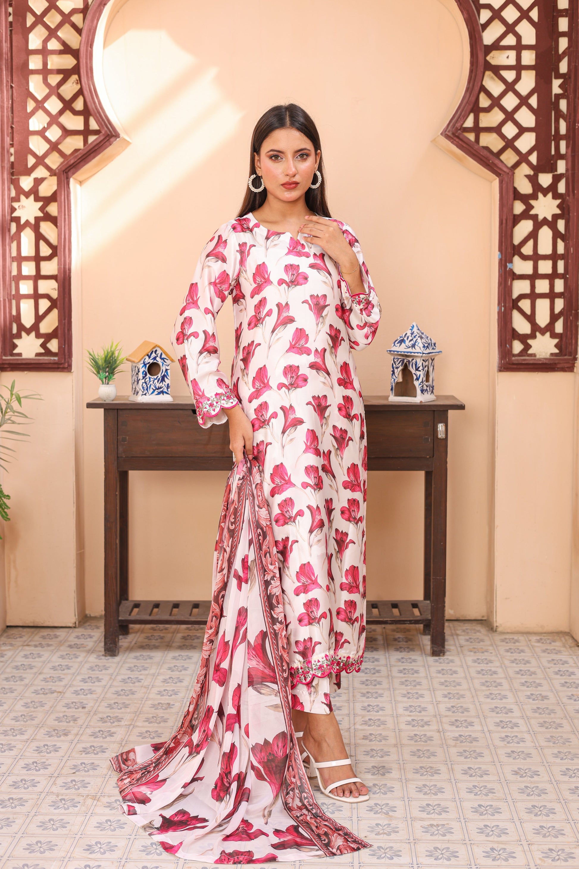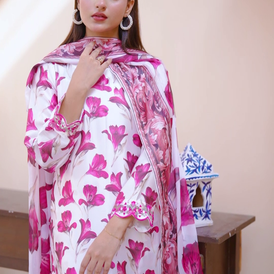 This sophisticated three-piece ensemble combines printed silk fabric with a lightweight chiffon silk dupatta, creating a harmonious balance of texture and elegance. Detailed embroidery on the sleeves and bottom enhances the design, offering a refined and polished look. Ideal for those who appreciate expert craftsmanship and luxurious comfort in their wardrobe.