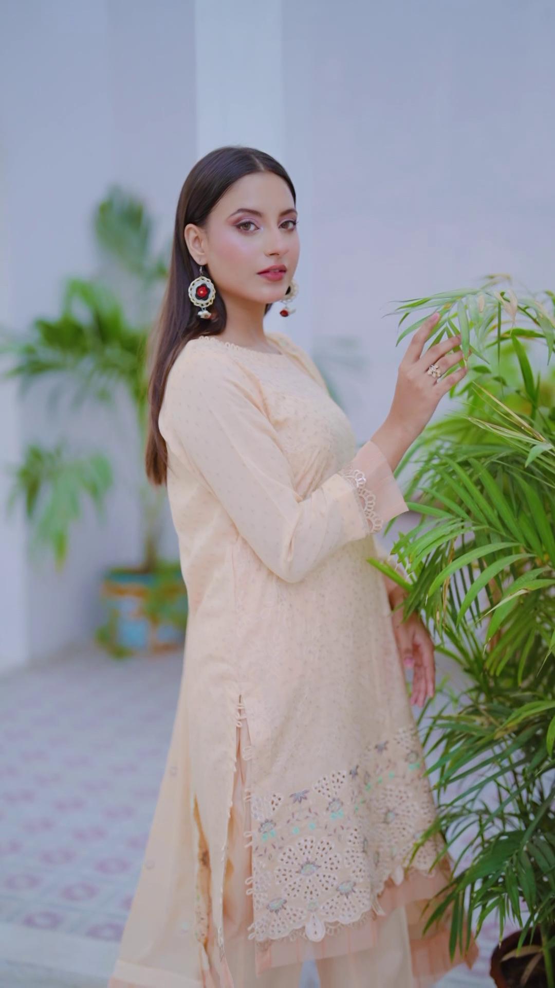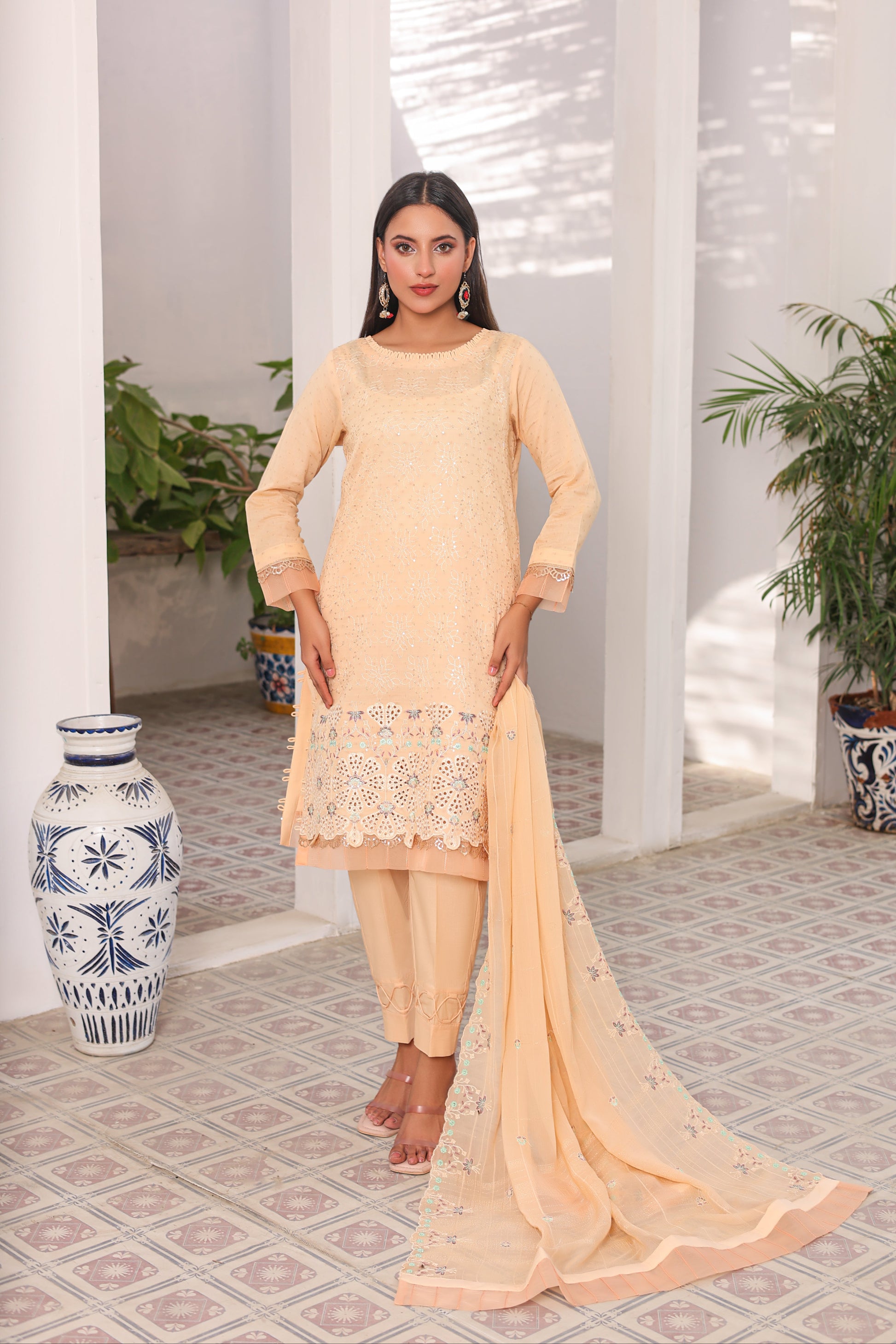 This refined three-piece ensemble features self-designed lawn fabric paired with a chicken kari embroidered shirt, highlighting expert craftsmanship and traditional artistry. The set is completed with an intricately embroidered dupatta, adding a sophisticated touch. Ideal for those seeking a blend of comfort, elegance, and timeless style.