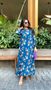 This elegant blue floral abaya features a vibrant pattern with orange, white, and light blue blooms scattered across the fabric. The long-sleeved design has a relaxed, flowing silhouette that falls gracefully to the ankles. The modest round neckline and loose fit create a comfortable yet sophisticated look, perfect for casual or semi-formal occasions. The rich navy base color beautifully complements the colorful floral motifs throughout.