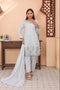 This sophisticated three-piece set includes a chicken kari shirt crafted from self-design lawn fabric, paired with an intricately embroidered dupatta that adds elegance and texture. Designed for comfort and style, this ensemble is perfect for those seeking a refined yet breathable outfit suitable for various occasions.