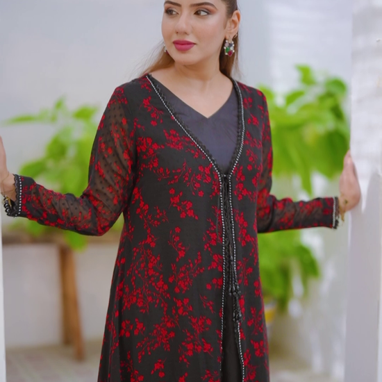 This elegant ensemble features a printed self-design chiffon front paired with an open coat, combining delicate texture with modern style. The black solid silk shirt and trousers offer a sleek, sophisticated contrast, ensuring comfort and a refined silhouette. Perfect for formal occasions, this outfit balances lightweight fabrics with a polished finish for a distinguished look.